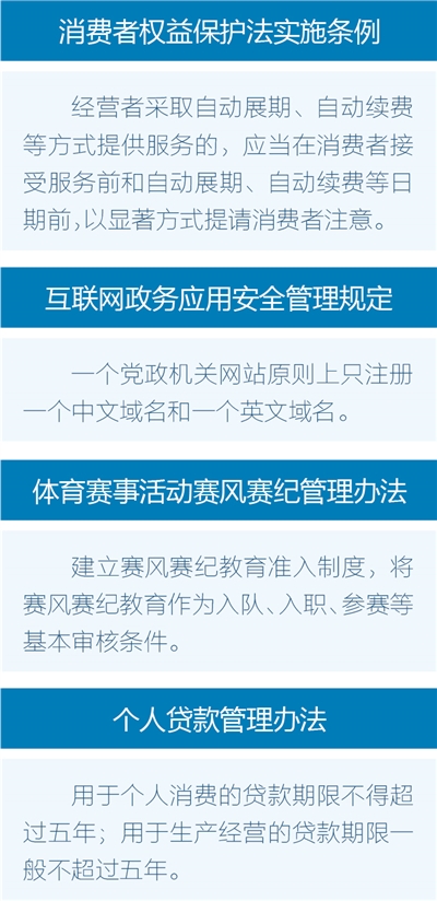编者按:经营者采取自动展期、自动续费等方式提供服务的,应当在消费者接受服务前和自动展期、自动续费等日期前,以显著方式提请消费者注意;机关事业单位通过互联网提供公共服务,不得绑定单一互联网平台……围绕社会民生、群众关切,服务发展大局、强化法治支撑,7月1日起,《中华人民共和国消费者权益保护法实施条例》《互联网政务应用安全管理规定》等一批法律法规施行,切实以法治力量护航经济社会高质量发展。