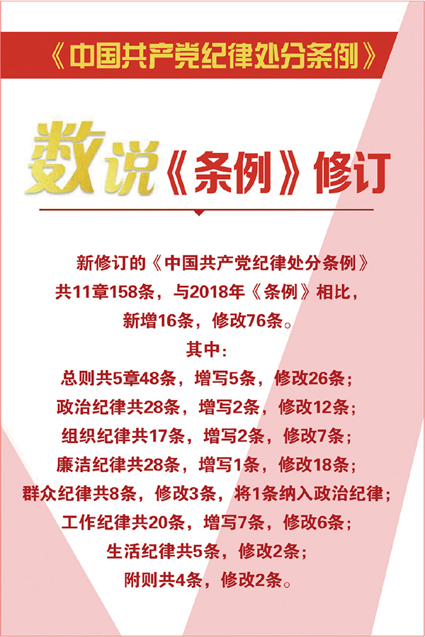 2023年新修订的《中国共产党纪律处分条例》,与时俱进完善纪律规范,与2018年《条例》相比,新增16条,修改76条,进一步扎紧织密制度笼子。
