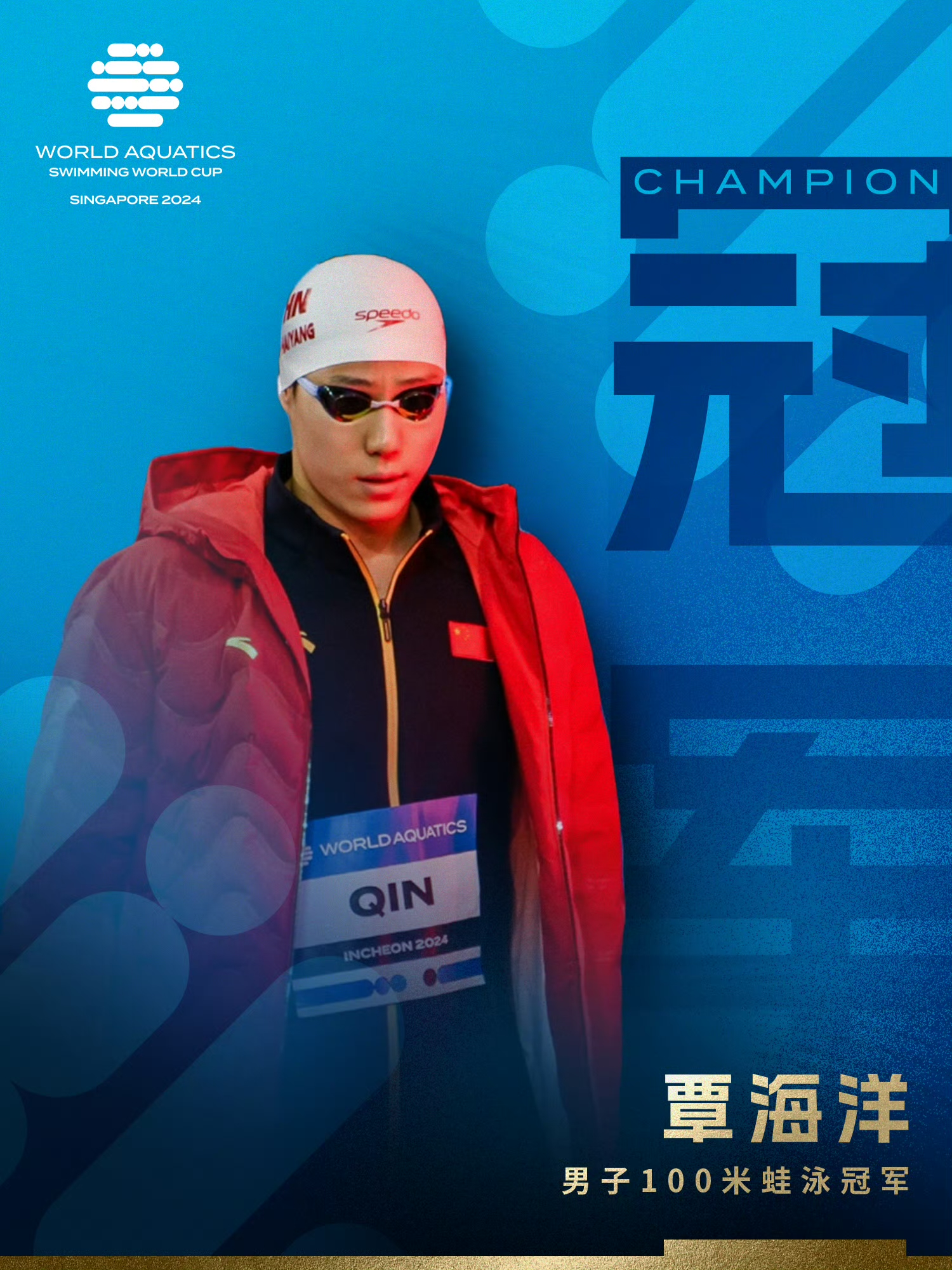 覃海洋夺得游泳世界杯新加坡站男子100米蛙泳金牌