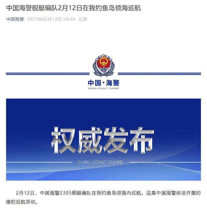 2月12日,中国海警2305舰艇编队在我钓鱼岛领海内巡航。这是中国海警依法开展的维权巡航活动。
