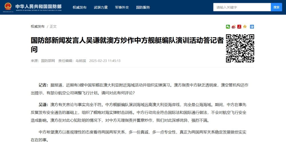 国防部新闻发言人吴谦就澳方炒作中方舰艇编队演训活动答记者问