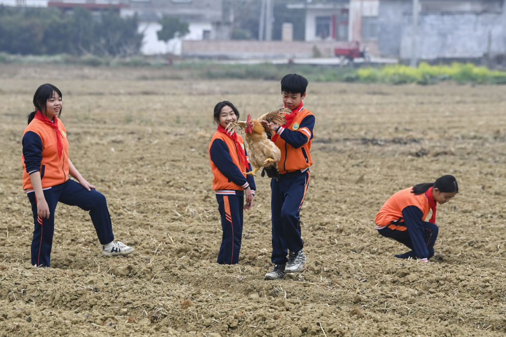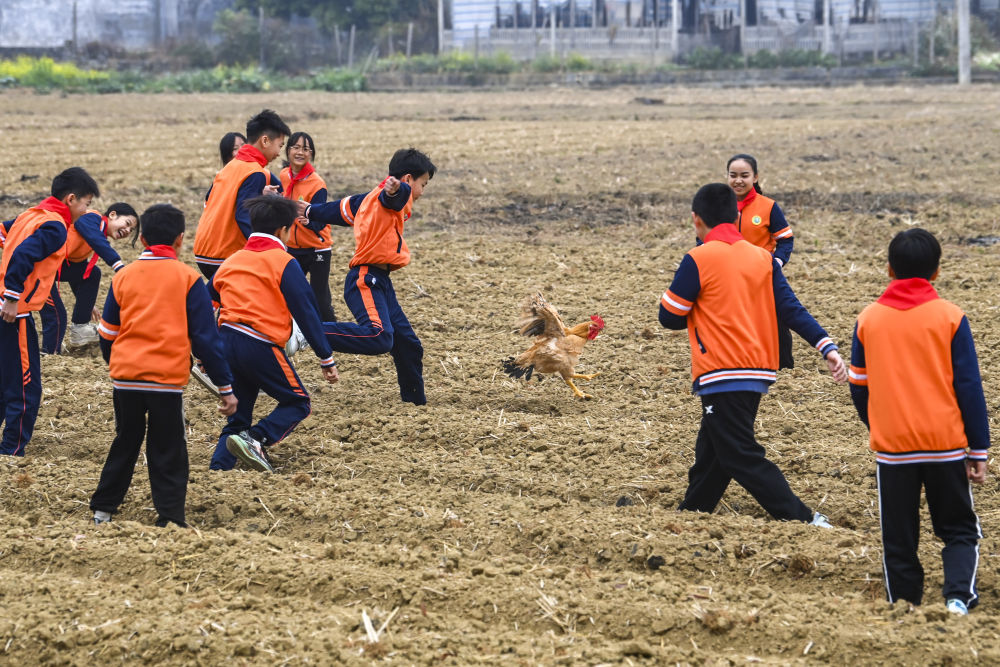 学生们玩起了抓鸡游戏