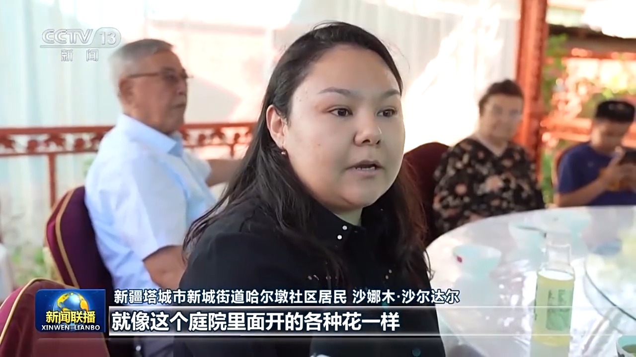 新疆塔城市新城街道哈尔墩社区居民 沙娜木·沙尔达尔:就像这个庭院里面开的各种花一样,也代表了咱们各民族,我们就是像石榴籽一样紧紧抱在一起的这么一个大家庭,真的是谁都离不开谁。