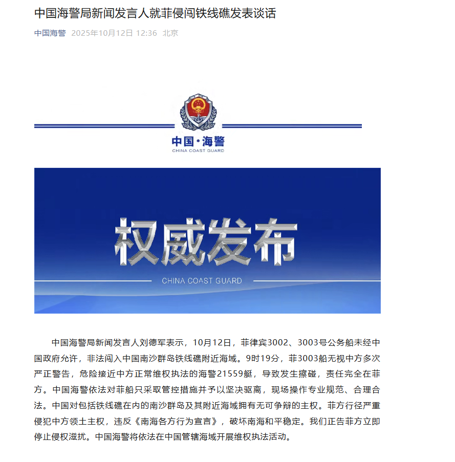 中国海警局新闻发言人刘德军表示,10月12日,菲律宾3002、3003号公务船未经中国政府允许,非法闯入中国南沙群岛铁线礁附近海域。9时19分,菲3003船无视中方多次严正警告,危险接近中方正常维权执法的海警21559艇,导致发生擦碰,责任完全在菲方。中国海警依法对菲船只采取管控措施并予以坚决驱离,现场操作专业规范、合理合法。中国对包括铁线礁在内的南沙群岛及其附近海域拥有无可争辩的主权。菲方行径严重侵犯中方领土主权,违反《南海各方行为宣言》,破坏南海和平稳定。我们正告菲方立即停止侵权滋扰。中国海警将依法在中国管辖海域开展维权执法活动。