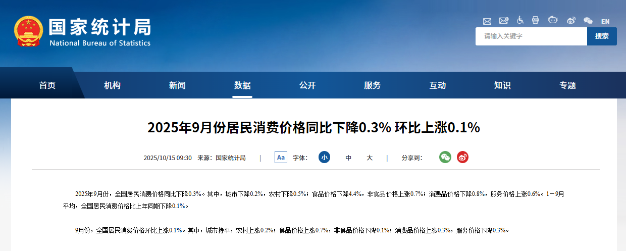 国家统计局:9月份居民消费价格同比下降0.3% 环比上涨0.1%