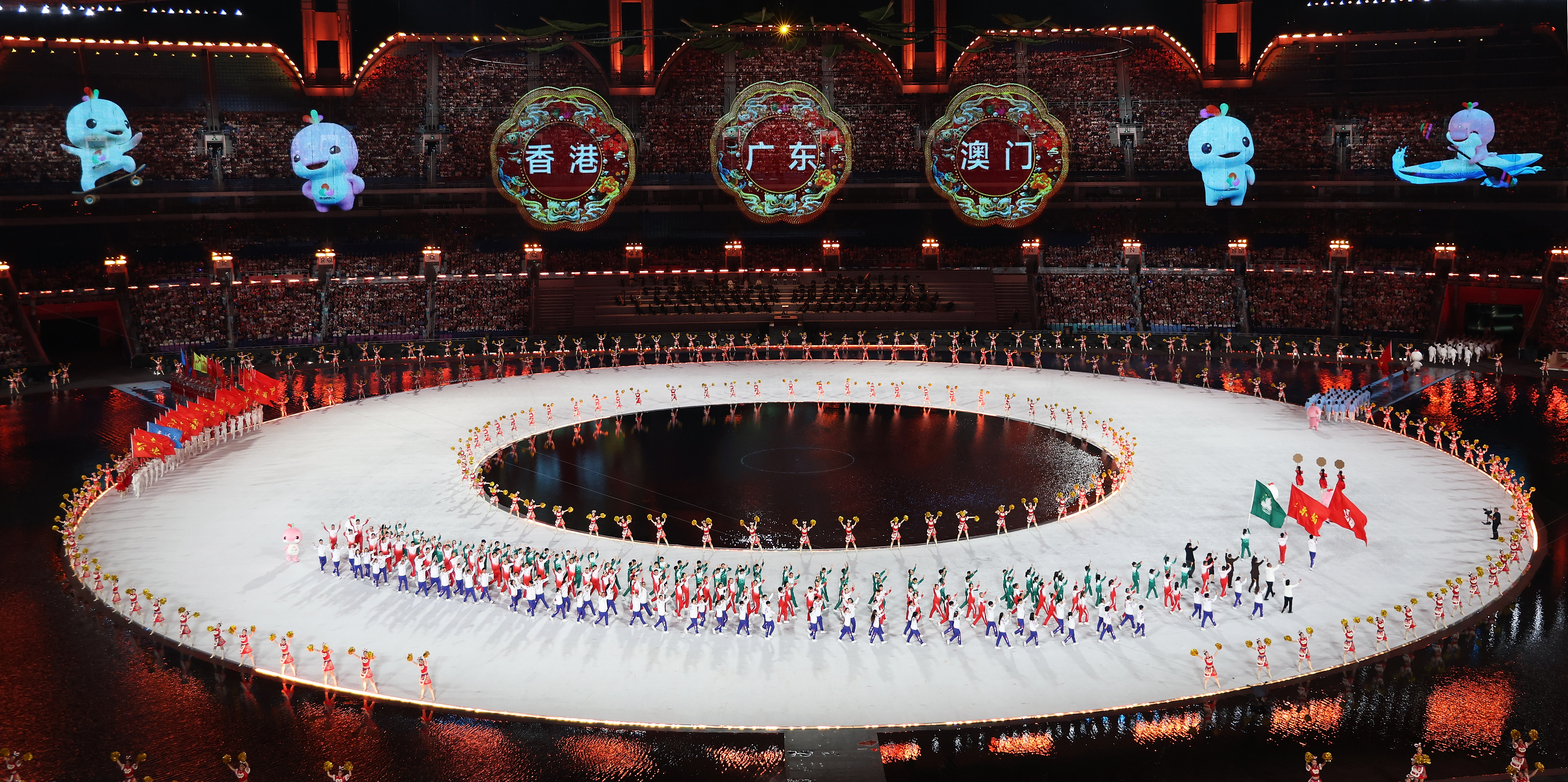 11月9日,广东省体育代表团、香港特别行政区体育代表团和澳门特别行政区体育代表团在入场仪式上共同入场。当日,第十五届全国运动会开幕式在广东奥林匹克体育中心举行。新华社记者 卢汉欣 摄