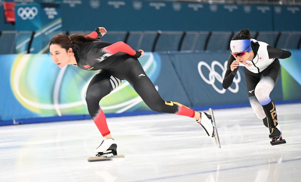 2月5日,中国运动员韩梅(左)和日本运动员高木美帆在训练中。新华社记者 武巍 摄