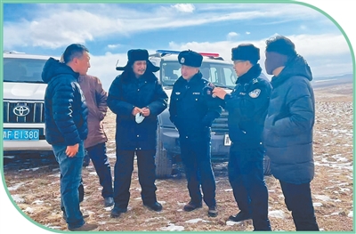 曲洋才让(右四)在与工作人员商议巡逻路线。受访者供图