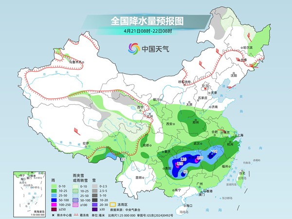 后天,内蒙古东北部、黑龙江西北部、新疆南疆东部山区、西藏东北部、青海中南部和东北部、甘肃祁连山山区、川西高原北部等地部分地区有小雪或雨夹雪;山西南部、河南大部、湖北东部和南部、安徽南部、江南大部、重庆东部、贵州中东部、广西北部、西藏东南部等地部分地区有中到大雨,其中,湖南中部、江西北部、贵州东部、广西北部等地部分地区有暴雨或大暴雨。