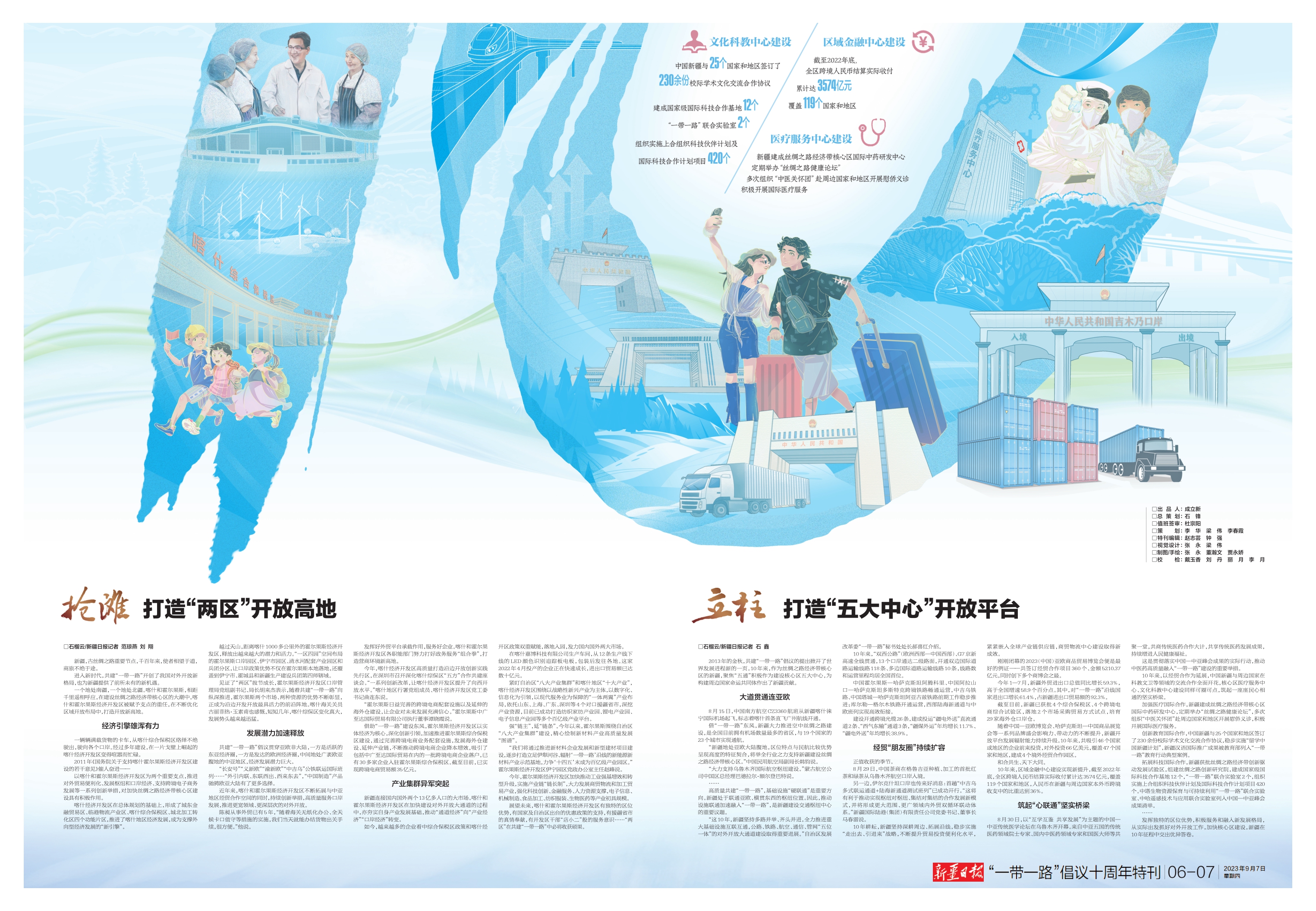 2013年的金秋,共建“一带一路”倡议的提出掀开了世界发展进程新的一页。10年来,作为丝绸之路经济带核心区的新疆,聚焦“五通”积极作为建设核心区五大中心,为构建周边国家命运共同体作出了新疆贡献。