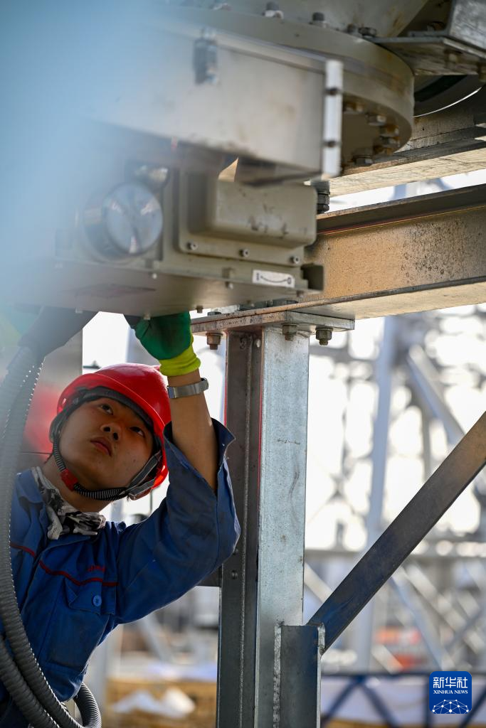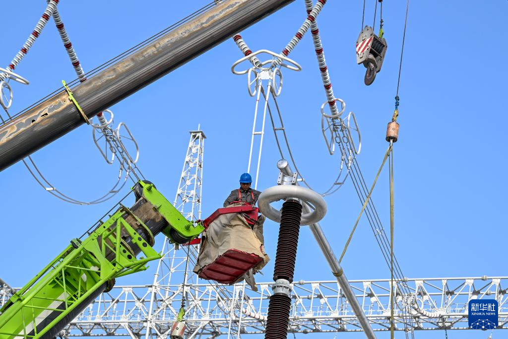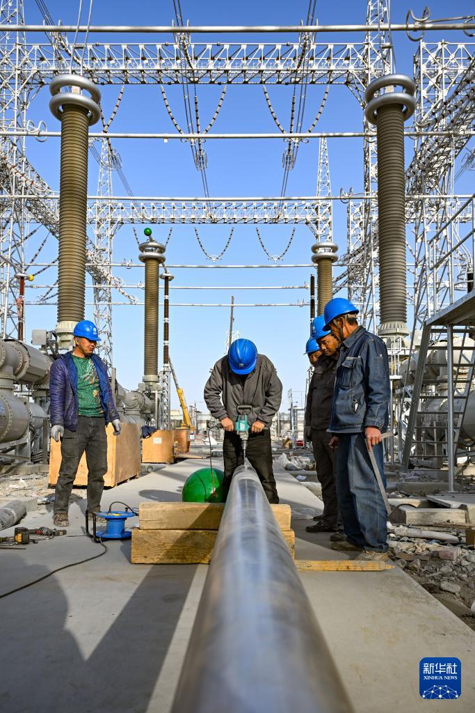 工人在新疆民丰750千伏变电站施工现场作业(11月10日摄)。新华社记者 陈朔 摄
