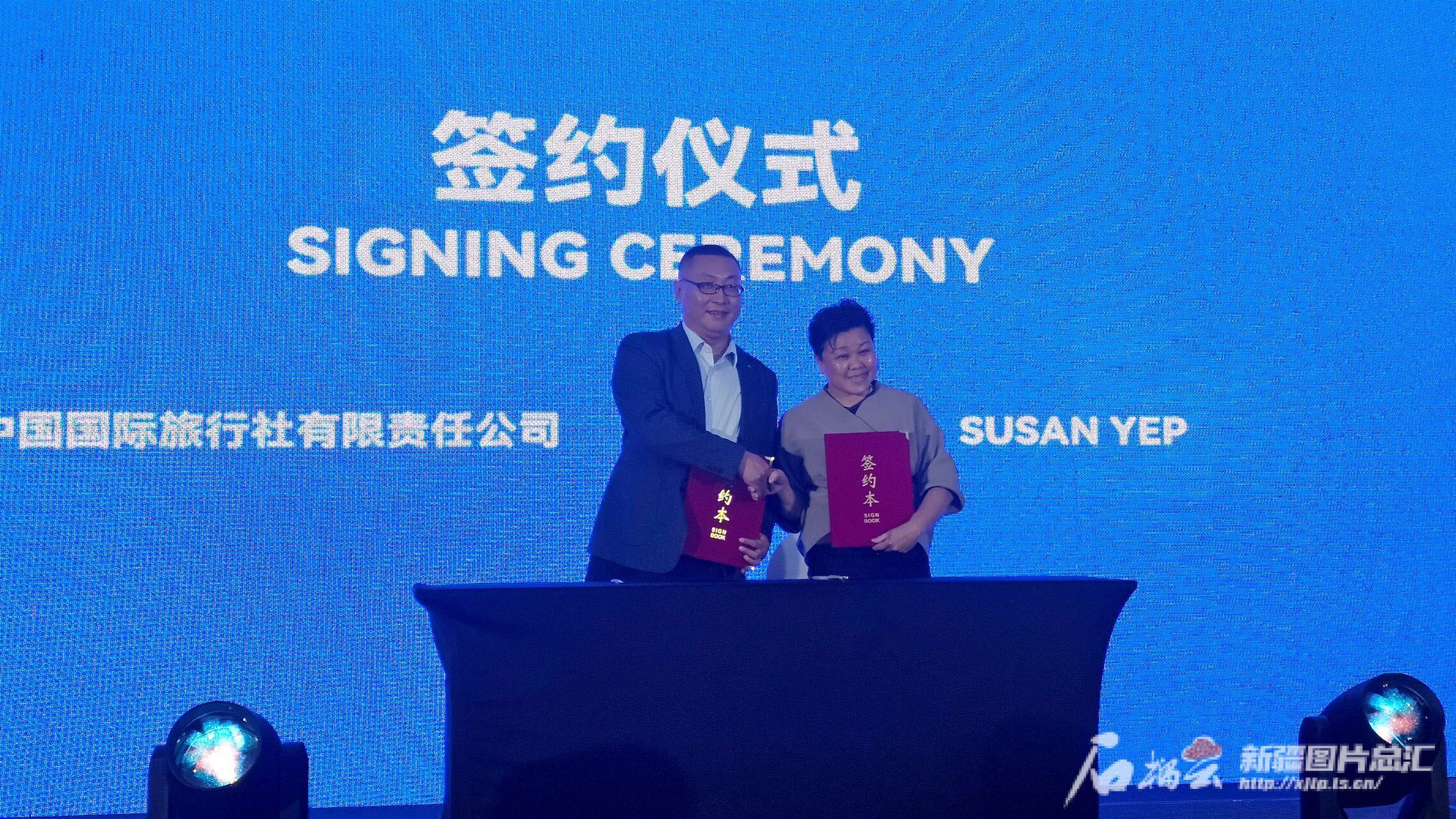 新疆中国国际旅行社有限责任公司总经理周迪(左一)与马来西亚网络达人叶淑森签订合作协议。天山网-新疆日报记者 王晶晶摄