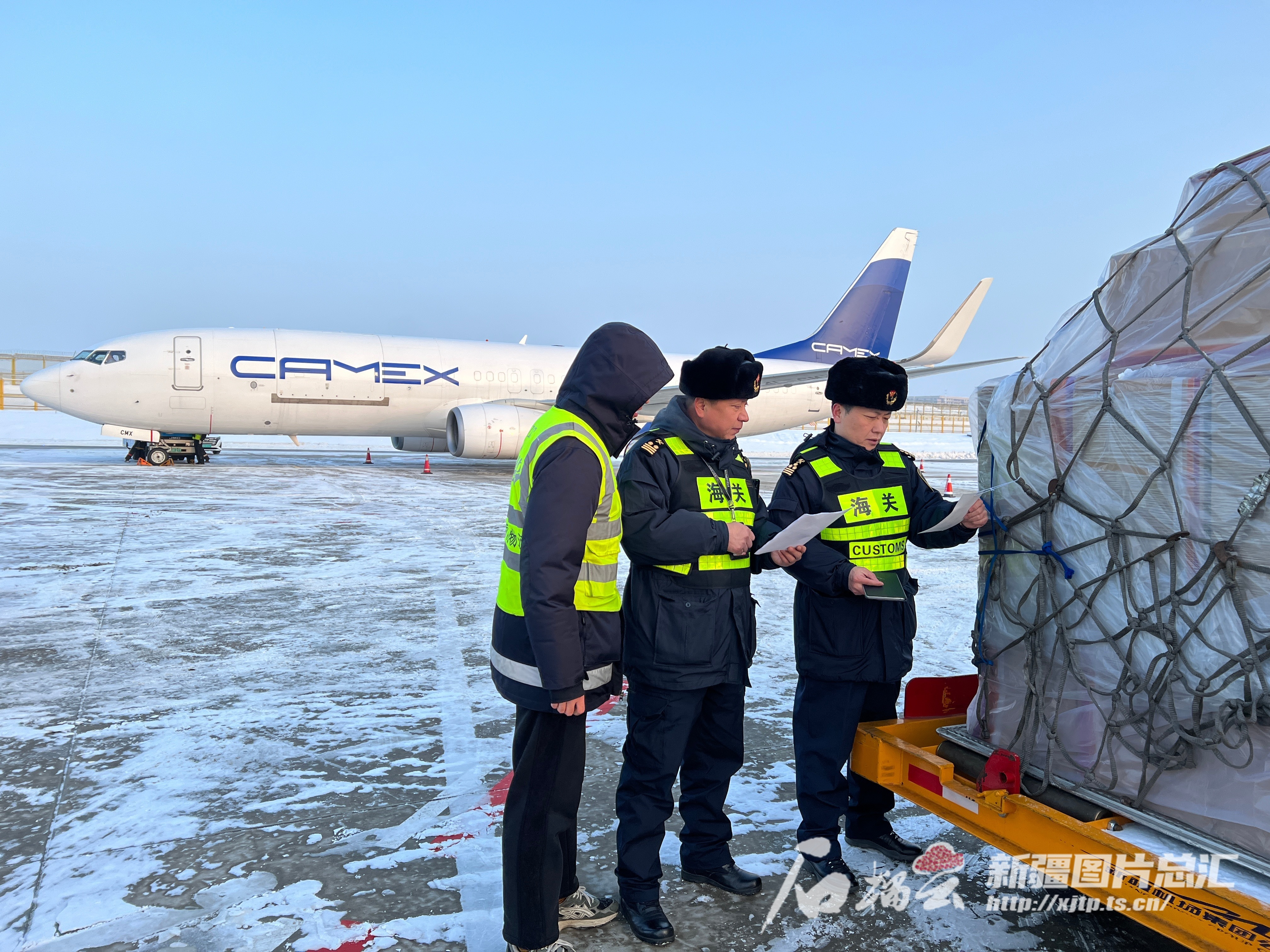 12月19日,乌鲁木齐地窝堡机场海关关员在监管乌鲁木齐—布加勒斯特货运航班的货物。赵蓓菁 摄