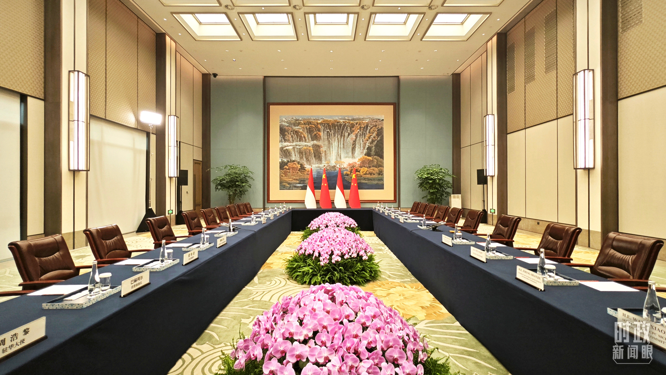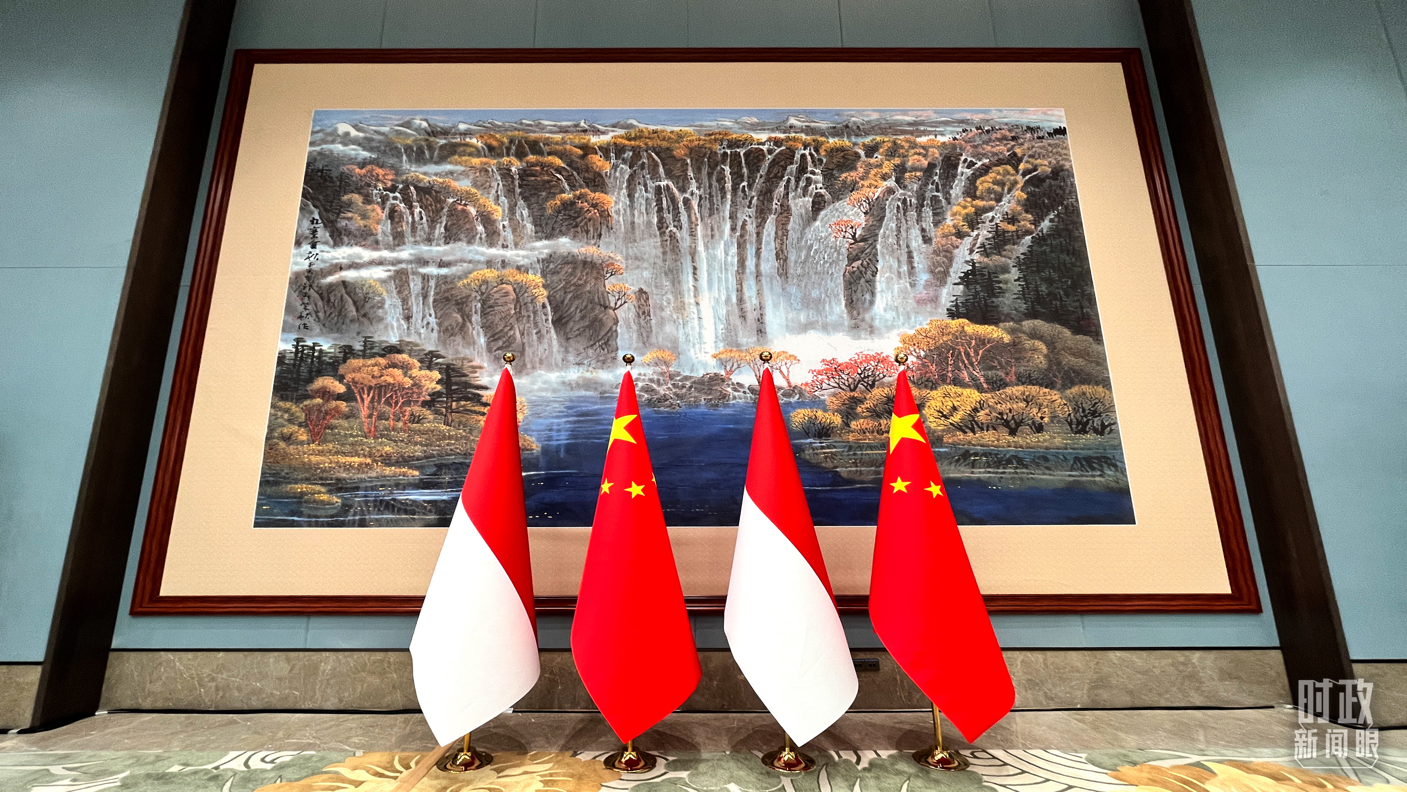 △会见现场的中印尼两国国旗。(总台央视记者张垚拍摄)