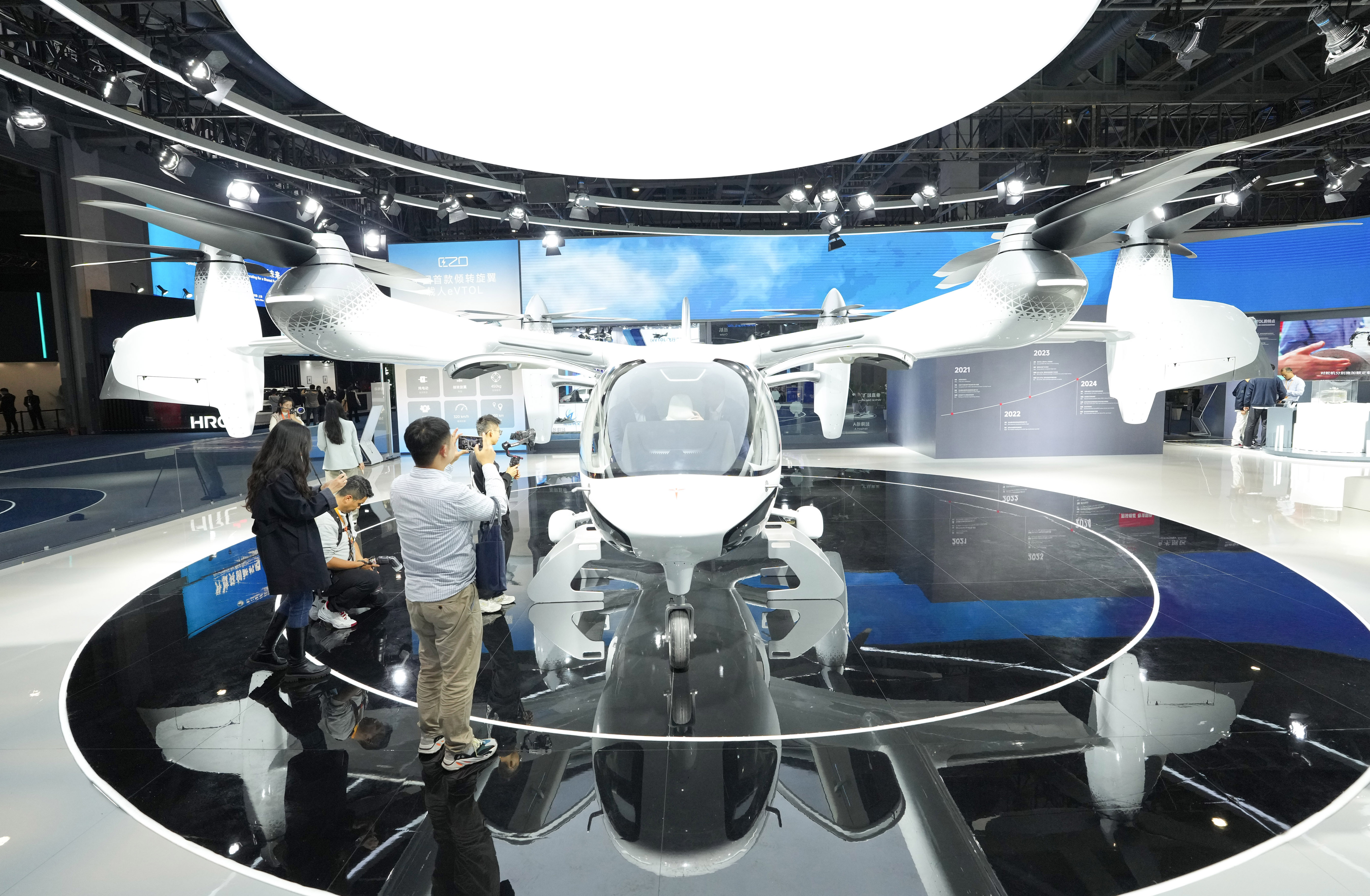 2025年11月5日在第八届进博会汽车及智慧出行展区拍摄的时的科技E20 eVTOL(电动垂直起降飞行器)。在第八届进博会上,一批新型移动出行产品与创新技术集中亮相。从智能驾驶到低空出行,从新能源解决方案到人性化设计……一幅多元化、立体化的未来出行图景正徐徐展开。