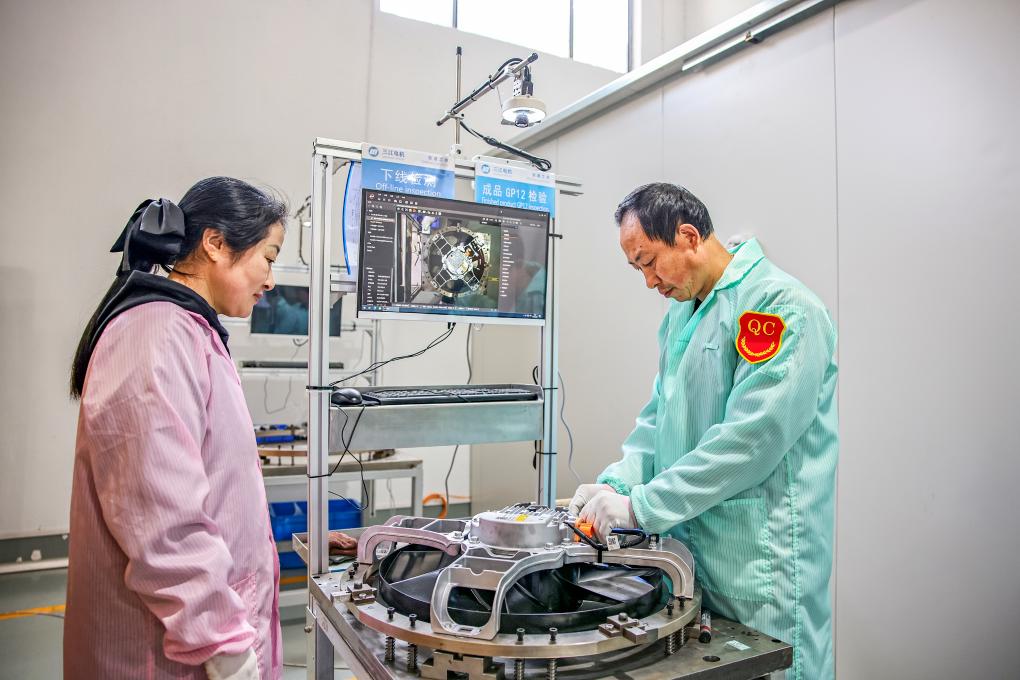 2026年4月2日,三江电器的工人正对电机产品进行下线检查。(受访者供图)