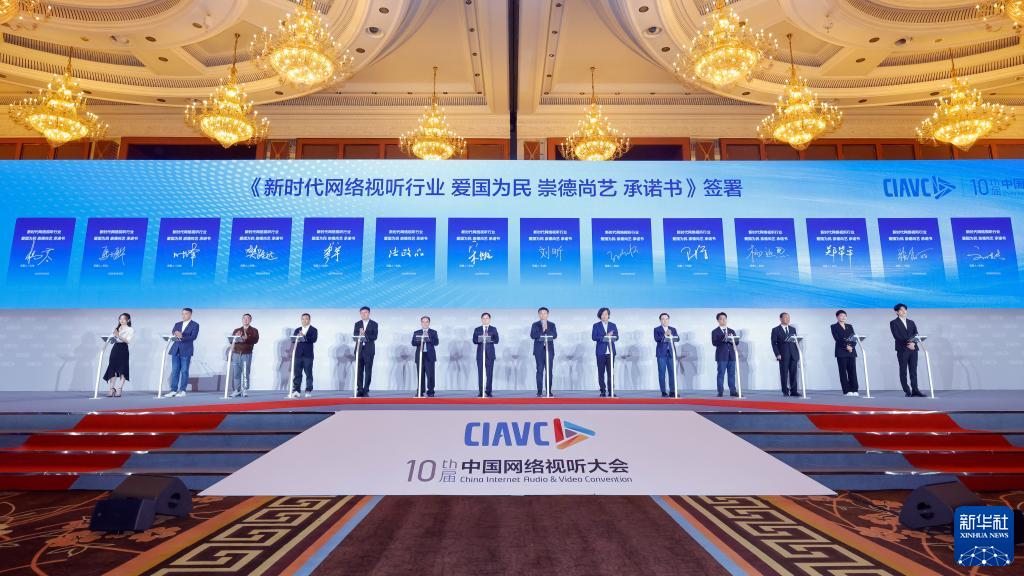 3月30日,在第十届中国网络视听大会行业发展与社会责任论坛上,行业代表签署《新时代网络视听行业爱国为民崇德尚艺承诺书》。新华社记者 沈伯韩 摄