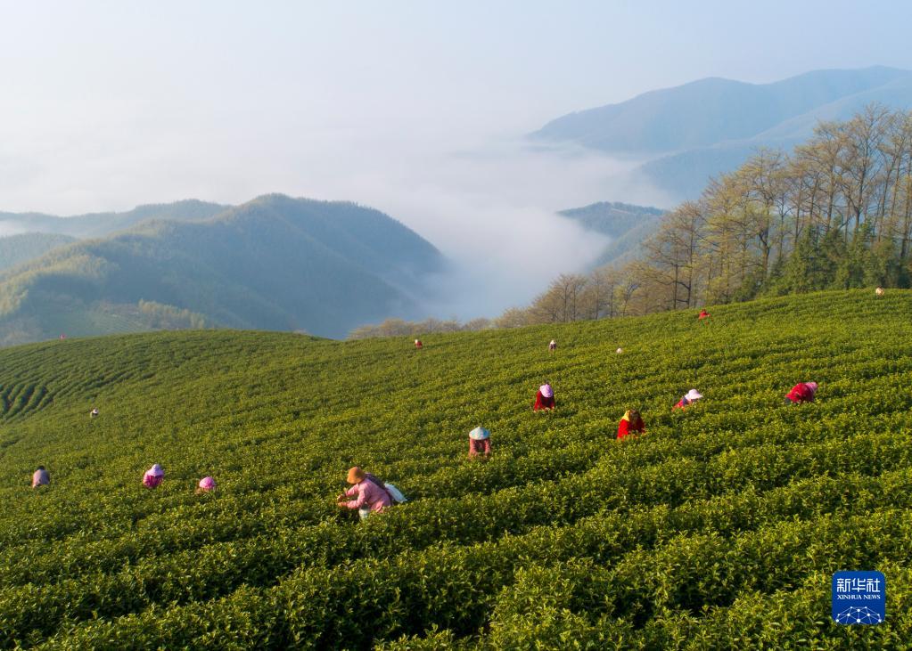 4月2日,采茶工在浙江省湖州市安吉县杭垓镇的生态茶园里采摘明前茶(无人机照片)。新华社发(夏鹏飞 摄)