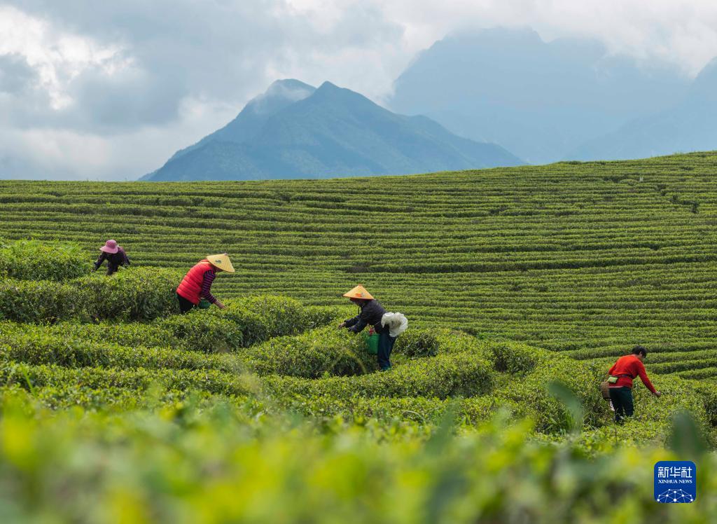 4月2日,采茶工在湖南省永州市江华瑶族自治县涛圩镇牛牯岭生态茶场采摘春茶。新华社发(蒋克青 摄)