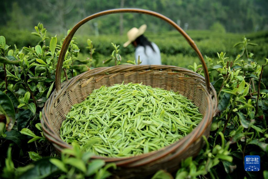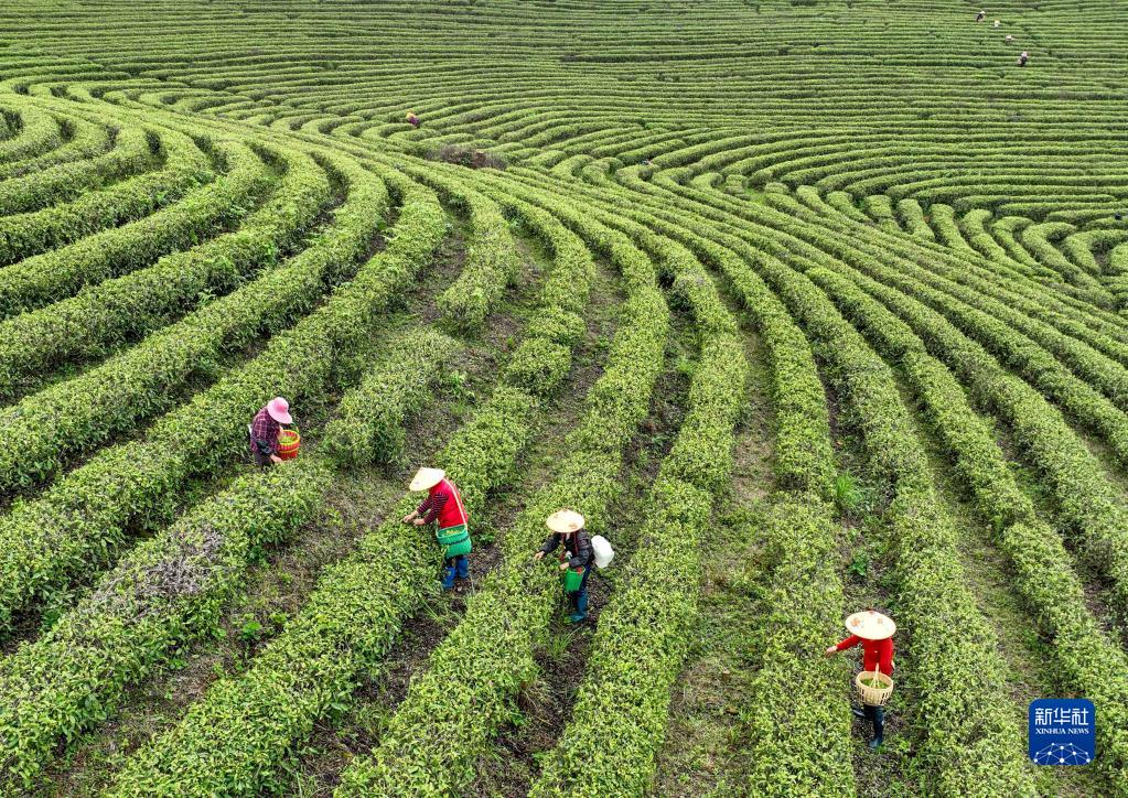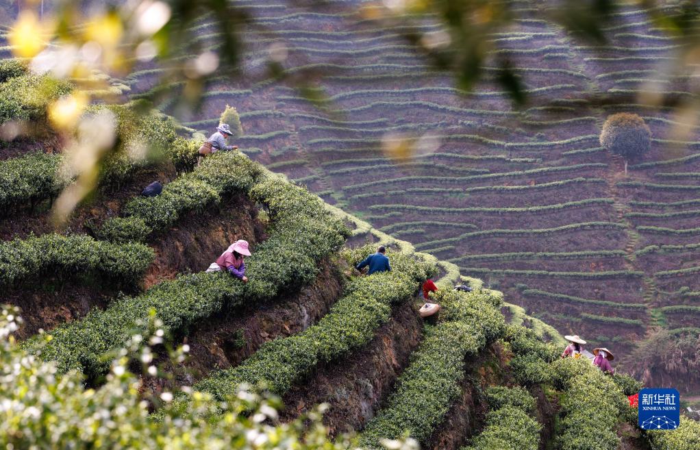 4月2日,茶农在湖北省十堰市郧阳区谭家湾镇圩坪寺村茶叶基地采摘茶叶。新华社发(曹忠宏 摄)