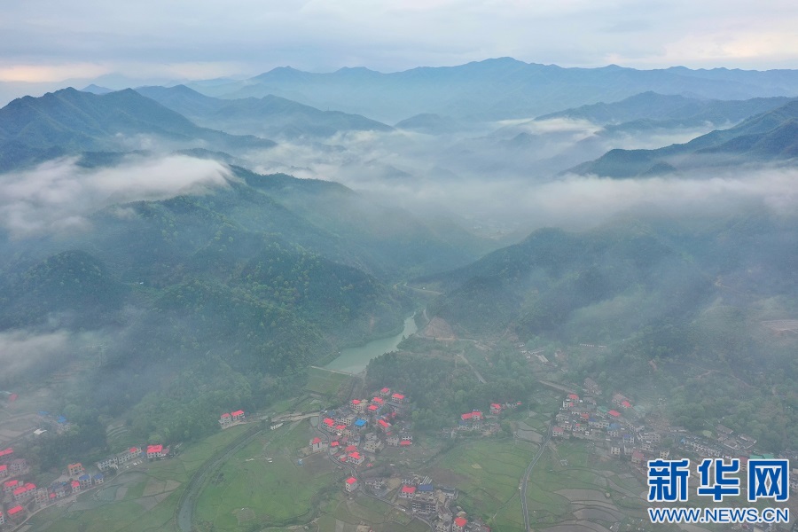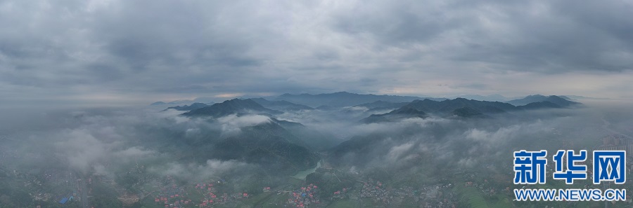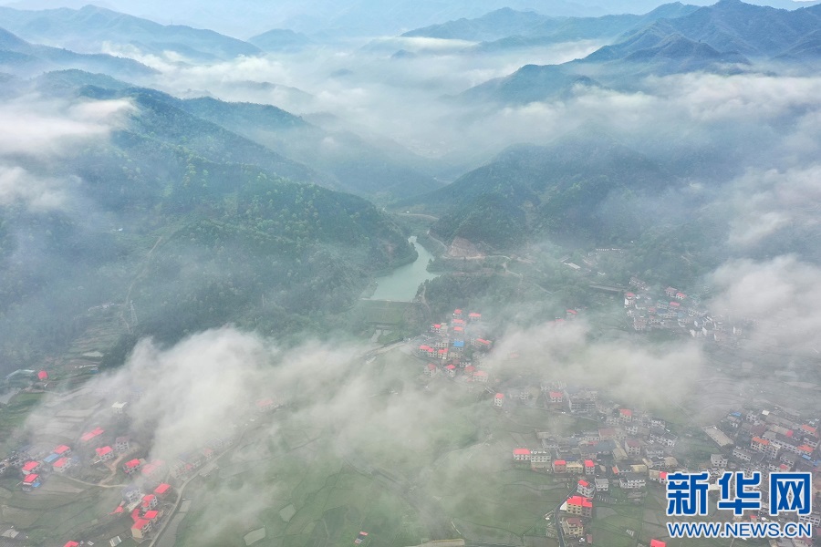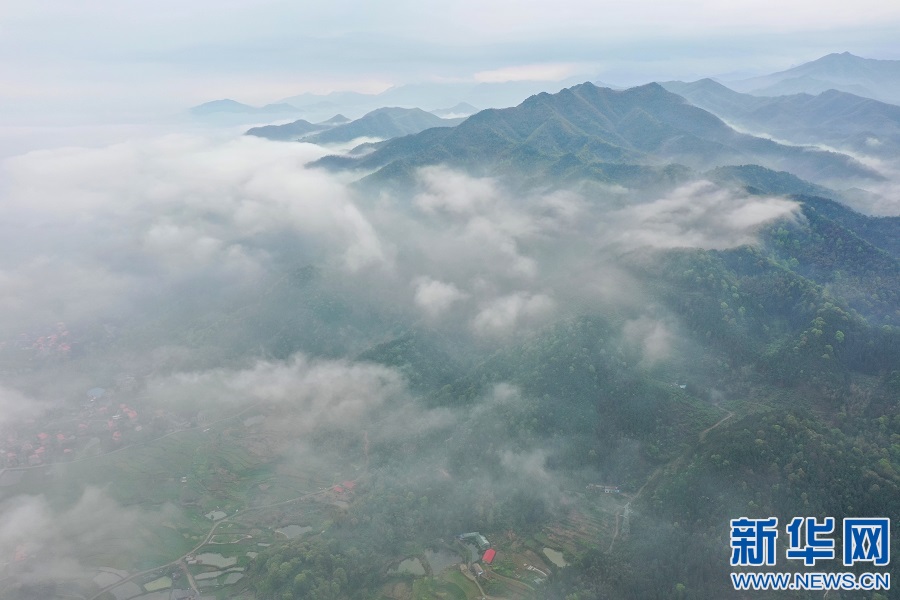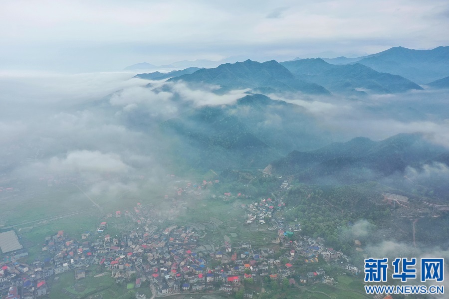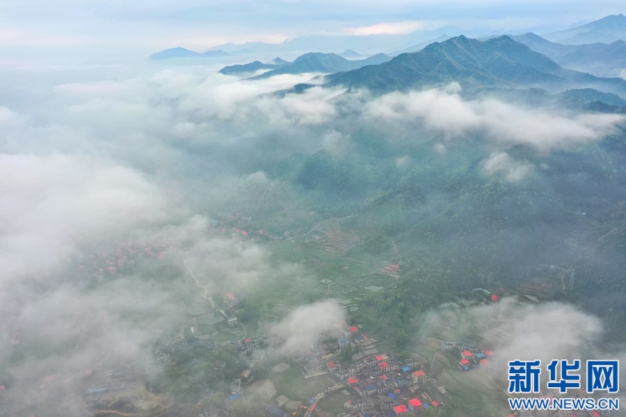 山峦、民居在云雾中若隐若现。新华网发 许安萍 摄