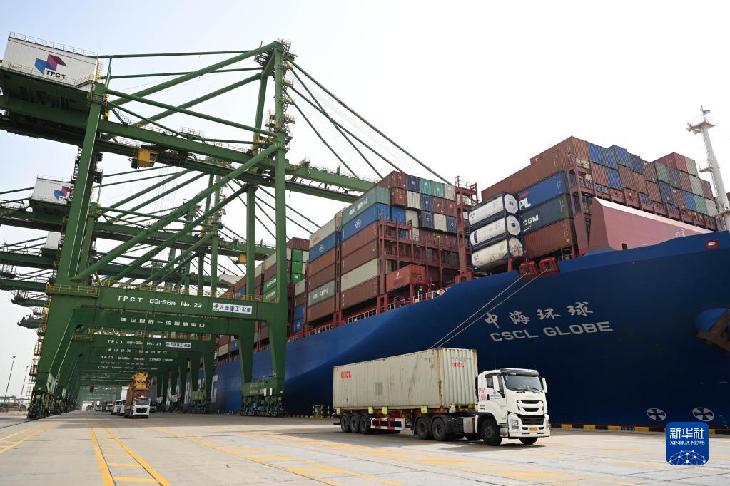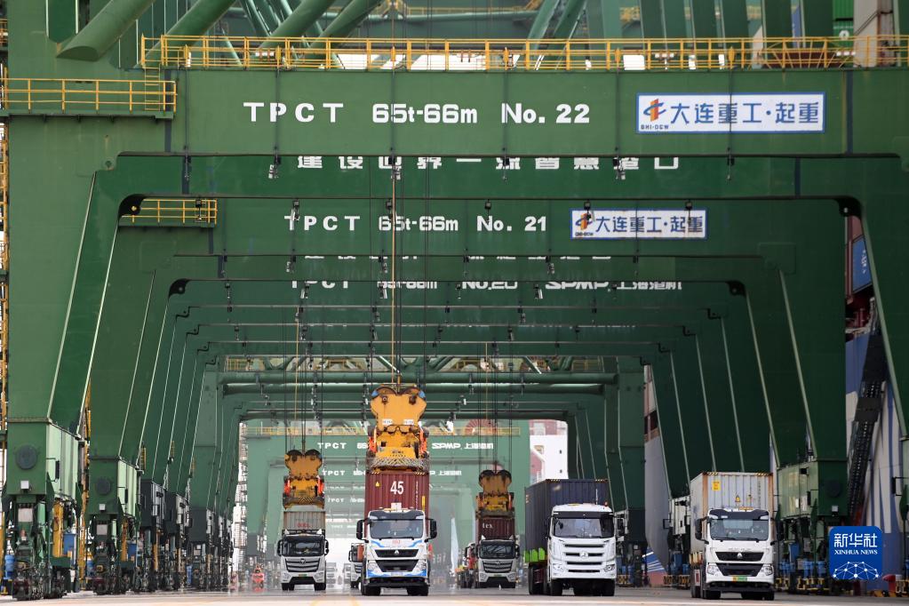 4月11日,卡车在天津港太平洋国际集装箱码头运输集装箱。新华社记者赵子硕 摄