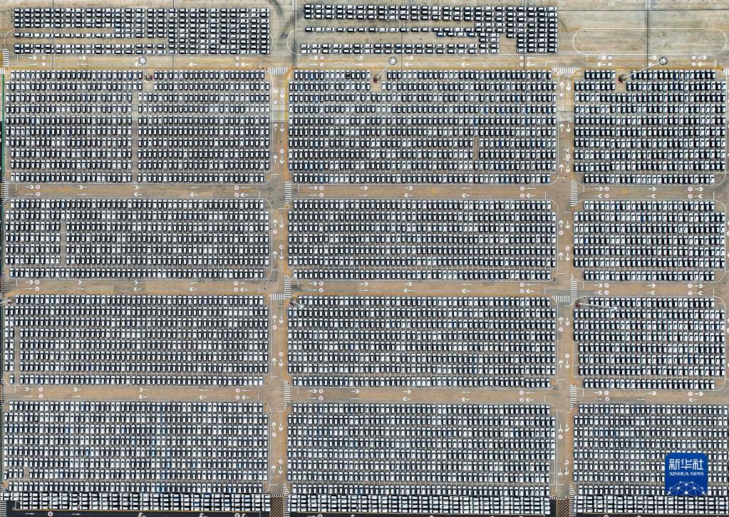 在天津港海嘉滚装码头,汽车排列整齐,等待装船(4月10日摄,无人机照片)。新华社发(夏德崧 摄)