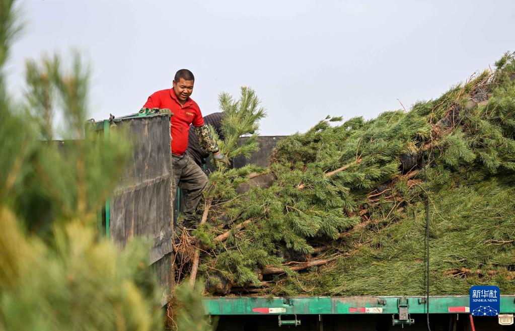 4月15日,在内蒙古通辽市科尔沁左翼后旗,治沙工人在运送树苗。 新华社记者 连振 摄