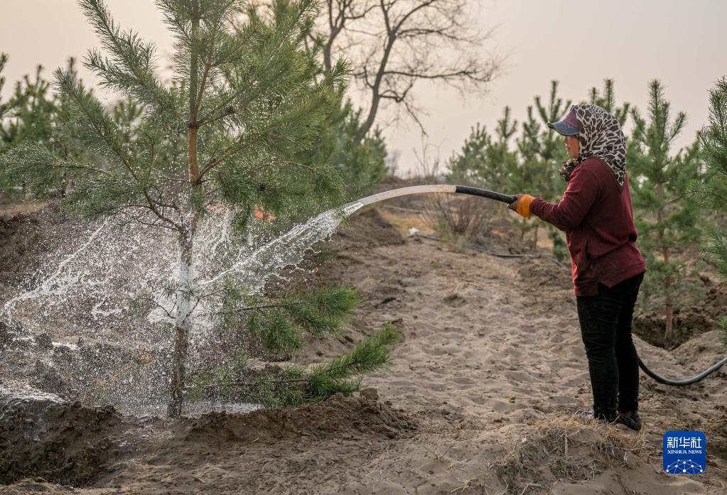 4月15日,在内蒙古通辽市科尔沁左翼后旗,治沙工人在科尔沁沙地给树木浇水。 新华社记者 连振 摄