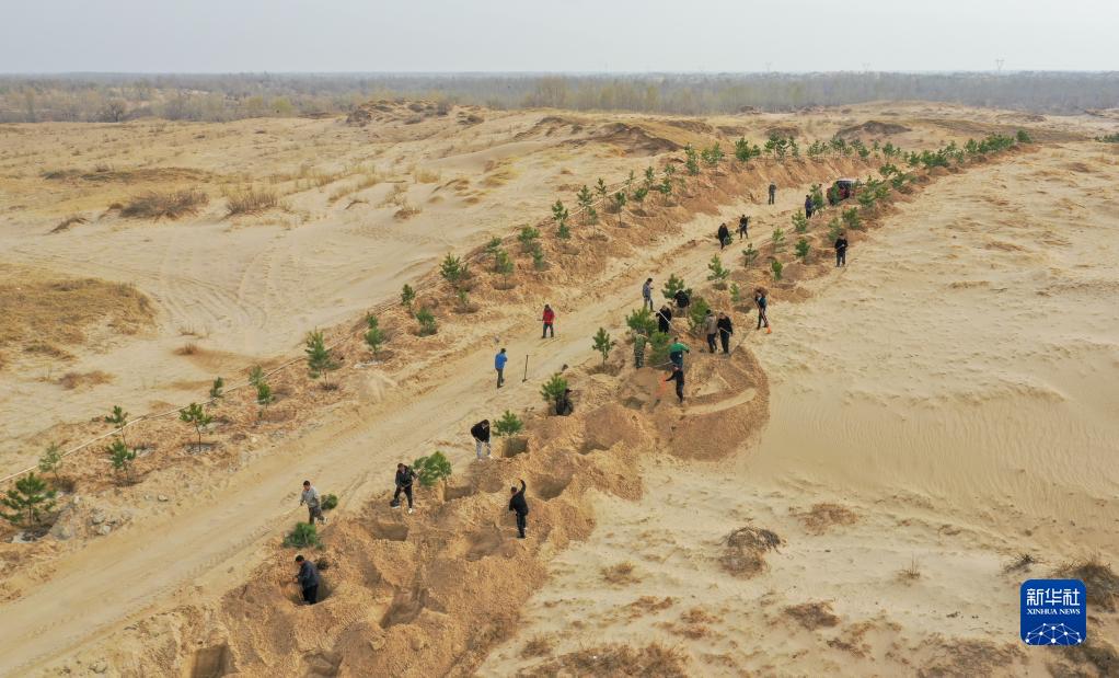 4月15日,在内蒙古通辽市科尔沁左翼后旗,治沙工人在科尔沁沙地植树造林(无人机照片)。 新华社记者 连振 摄