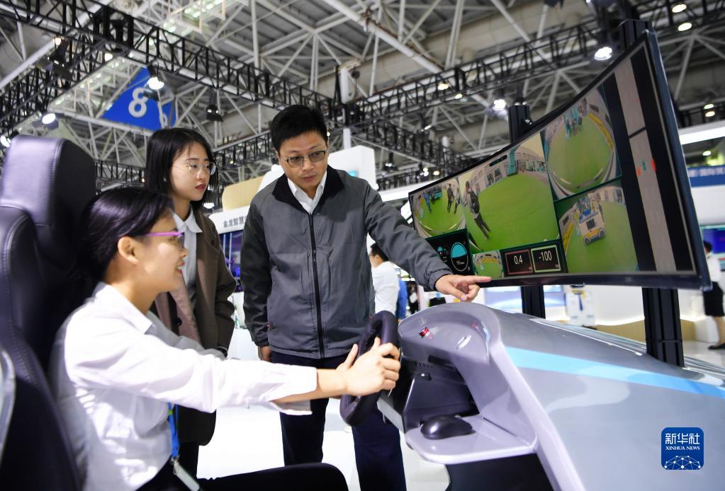 4月26日,在第六届数字中国建设成果展览会上,观众体验金龙5G远程驾驶。新华社记者 魏培全 摄
