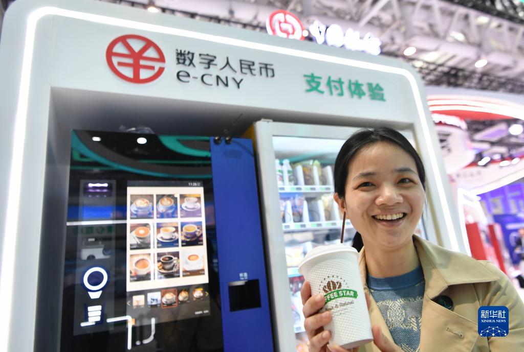 4月26日,在第六届数字中国建设成果展览会现场,一名观众展示用数字人民币购买的咖啡。新华社记者 魏培全 摄
