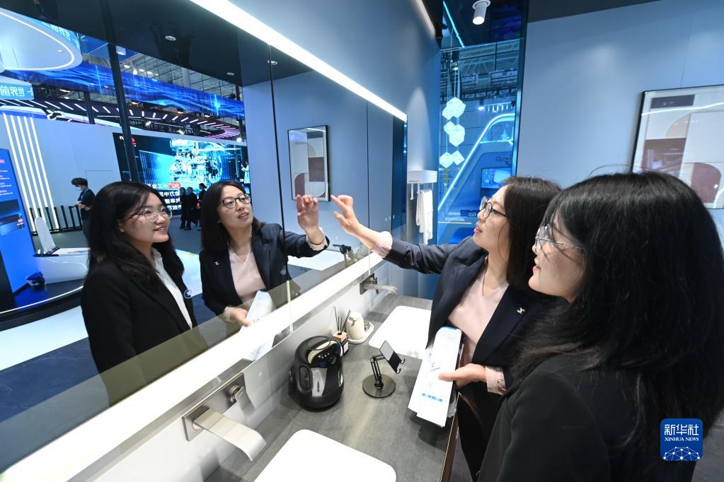 4月26日,参观者在展览现场了解支持鸿蒙智联的九牧卫浴智能产品。新华社记者 林善传 摄