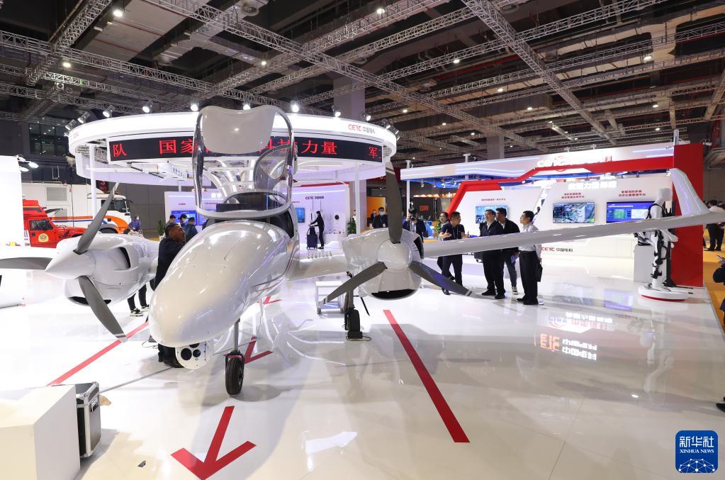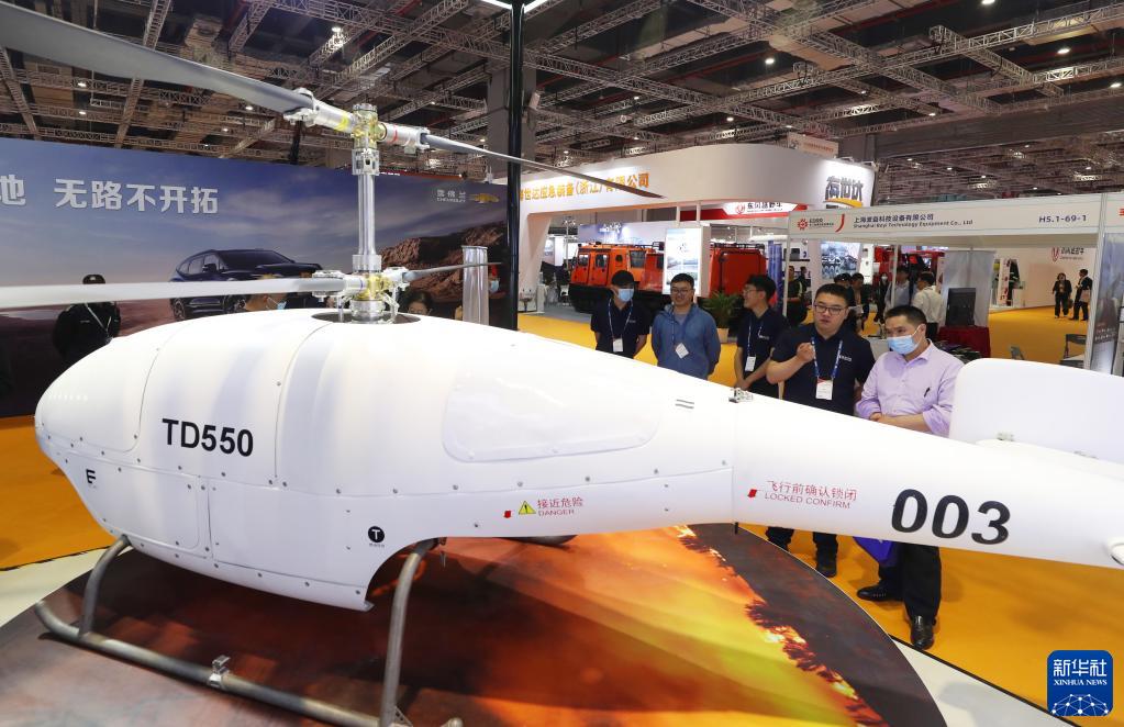 5月8日,参观者在一架大载重应急救援无人机旁交流。新华社记者 方喆 摄