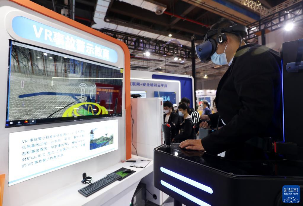 5月8日,参观者在展会上体验一款VR事故警示教育系统。新华社记者 方喆 摄
