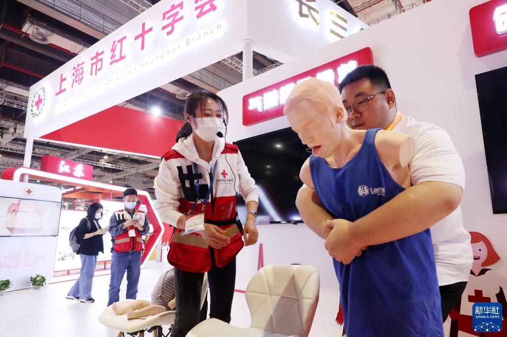 5月8日,一位参观者在工作人员指导下体验气道梗阻应急救援操作。新华社记者 方喆 摄