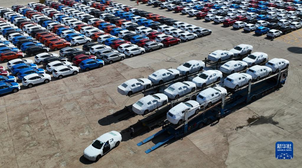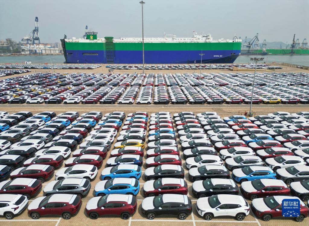 5月9日,在山东港口烟台港,大批出口商品车集结到港准备通过汽车滚装船发运(无人机照片)。新华社发(唐克摄)