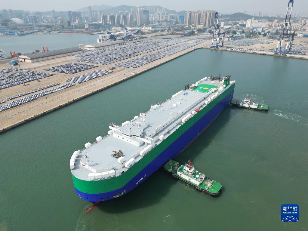 5月9日,一艘汽车滚装船靠泊山东港口烟台港装载出口商品车(无人机照片)。新华社发(唐克摄)