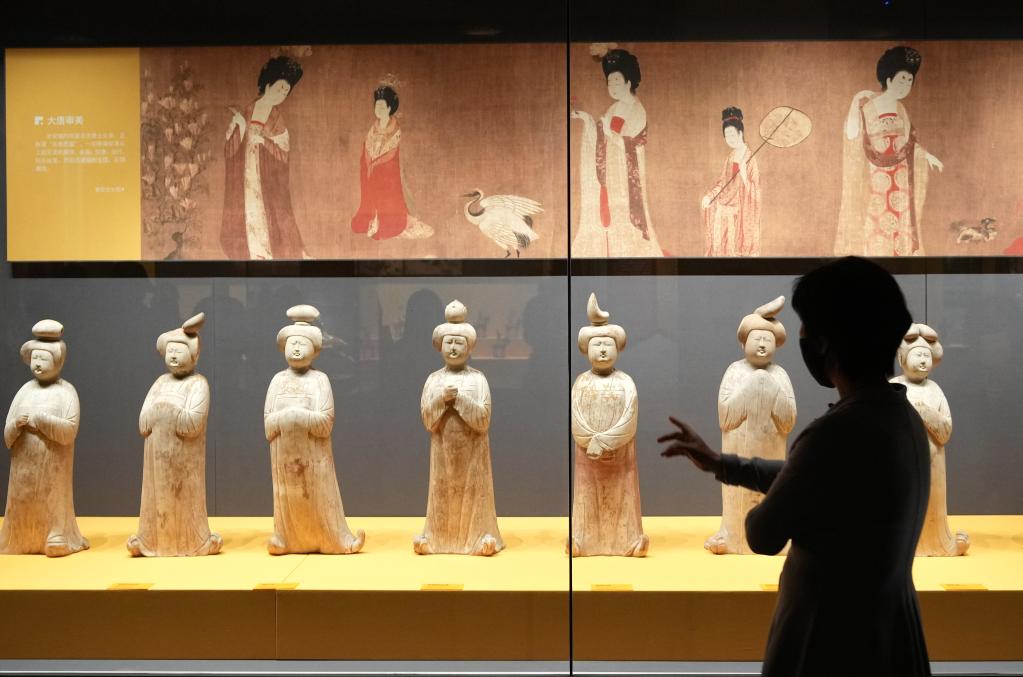 2022年4月13日,观众在西安博物院参观唐代女立俑。 新华社记者 李一博 摄