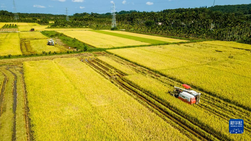 5月16日,海南省琼海市博鳌镇北岸村农民在抢收早稻(无人机照片)。目前,琼海早稻陆续成熟,当地农民加紧投入抢收。新华社发(蒙钟德摄)