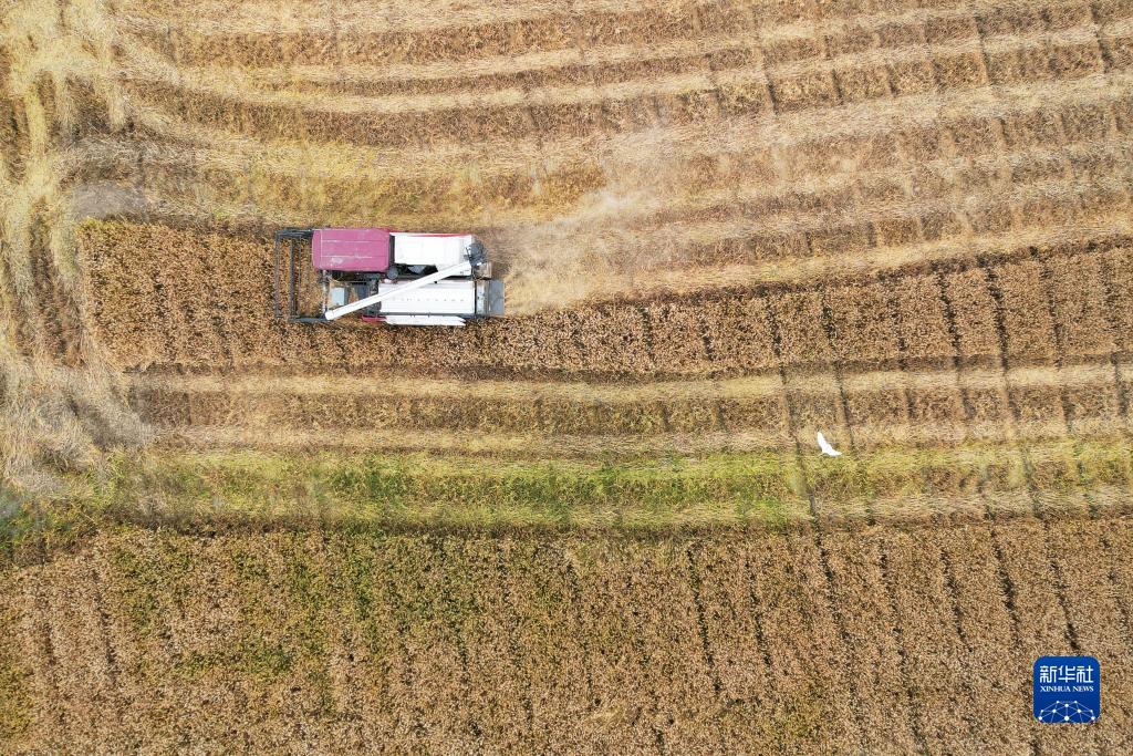 5月16日,杭州市萧山区盈丰街道的麦田里,农机手驾驶收割机收小麦(无人机照片)。近日,杭州萧山区盈丰街道的数千亩小麦迎来收获季。新华社发(龙巍摄)