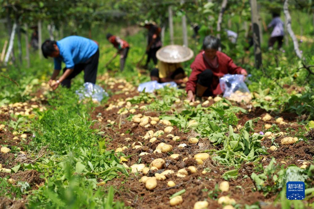 5月16日,贵州省黔南布依族苗族自治州福泉市陆坪镇罗坳村村民在分拣土豆。近日,福泉市陆坪镇罗坳村猕猴桃基地里套种的土豆迎来收获季。新华社发(肖伟 摄)
