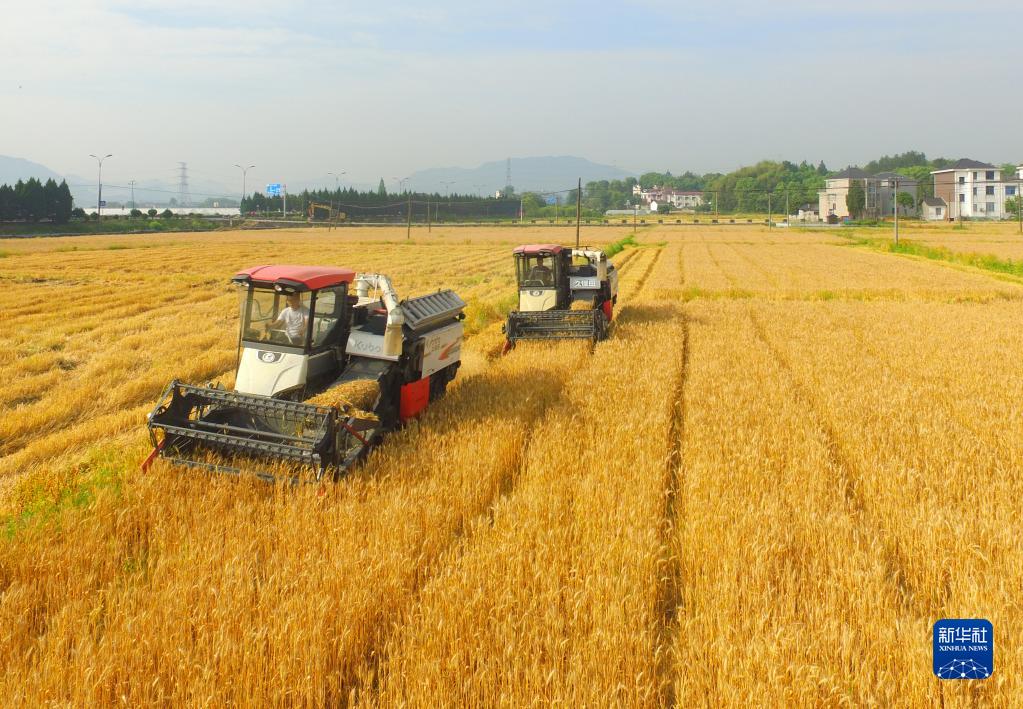5月16日,在浙江省建德市寿昌镇山峰村田间,农民驾驶农机收割小麦(无人机照片)。新华社发(宁文武摄)