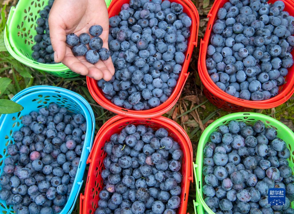 5月16日,在湖南省永州市道县梅花镇社湾村,村民在收获蓝莓。目前,永州市道县果农种植的蓝莓陆续成熟,开始采摘。新华社发(蒋克青 摄)