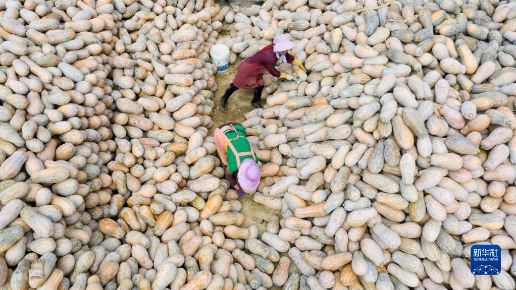 5月16日,广西南宁市西乡塘区金陵镇龙达村农民整理堆放的南瓜(无人机照片)。目前,南宁市西乡塘区金陵镇南瓜进入上市旺季,吸引区内外客商前来收购。新华社发(赵京武 摄)