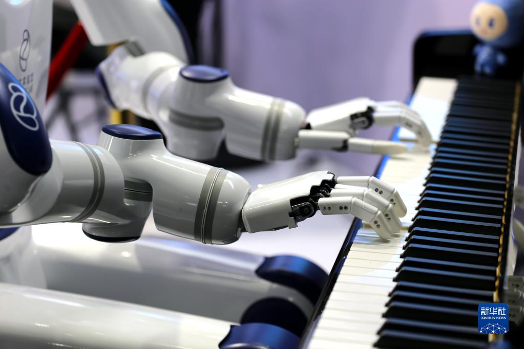 5月24日,机器人在峰会现场弹奏钢琴。新华社发(吴大庆摄)