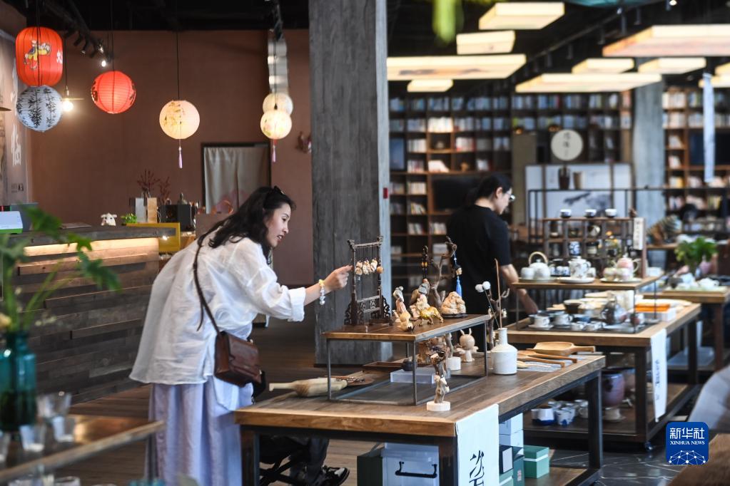 在位于杭州临安吴越文化公园的“地道吴越”民间手工艺文化空间内,顾客在挑选特色手工艺制品(5月14日摄)。该文化空间集临安非遗、临安民艺、文创研学、休闲体验为一体,近百件临安民艺产品在这里汇集。