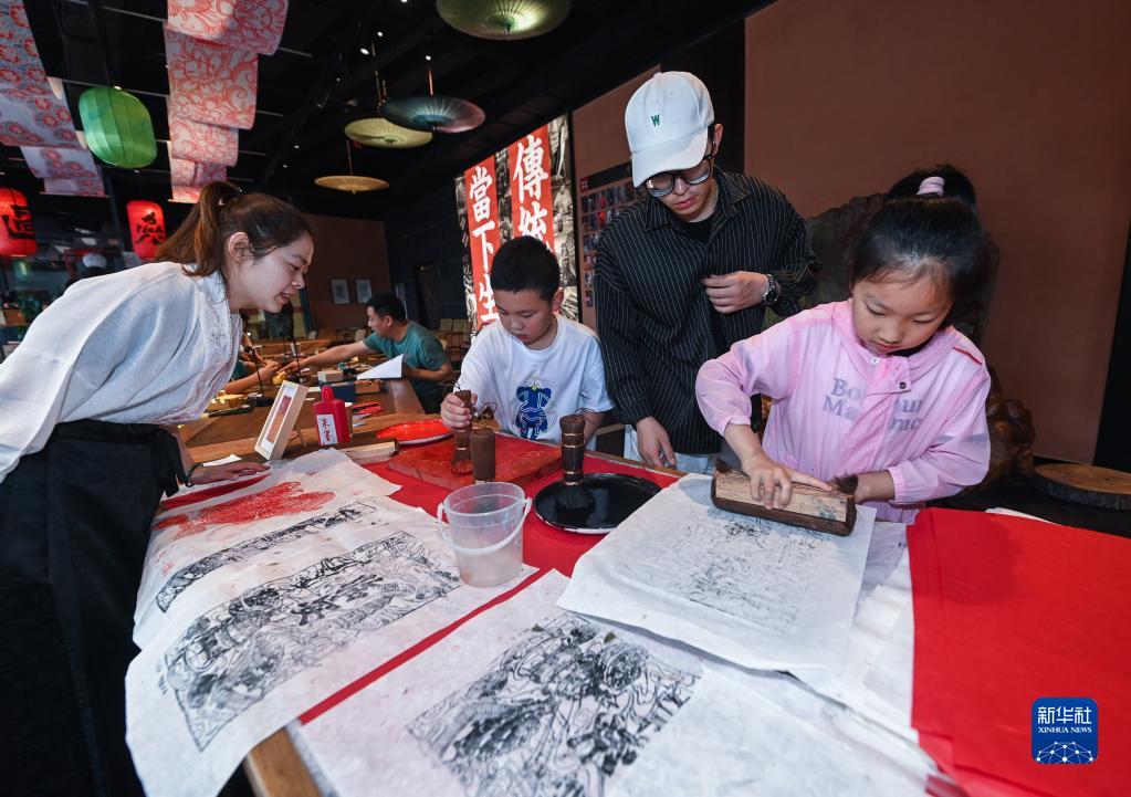 在位于杭州临安吴越文化公园的“地道吴越”民间手工艺文化空间内,孩子们在老师的带领下学习木版年画拓印技艺(5月14日摄)。新华社记者 徐昱 摄
