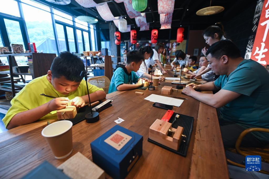 在位于杭州临安吴越文化公园内的“地道吴越”民间手工艺文化空间内,孩子们在老师的带领下学习篆刻技艺(5月14日摄)。新华社记者 徐昱 摄
