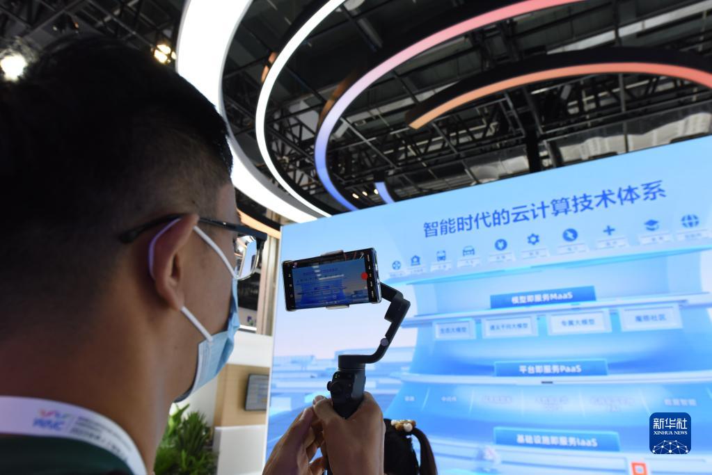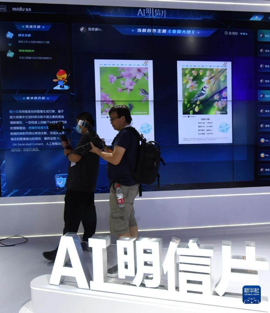 7月5日,两名记者在一家厂商展位拍摄“AI明信片”。新华社记者 黄晓勇 摄
